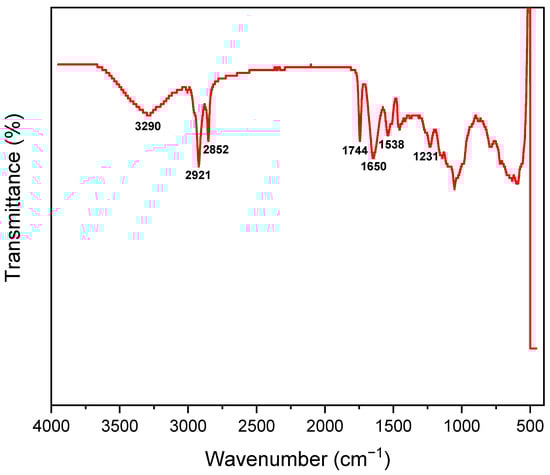 Infrared spectral analysis (Thermo Fisher Scientific, Waltham, MA, USA) was used to identify the primary functional groups found in the seeds of MOP. As can be observed in Figure 2, the bandwidth peak at 3290 cm−1 may be ascribed to the O-H stretching in the fatty acids, protein, lignin, and carbohydrates units. Because of the seed’s substantial protein composition, N–H stretching in amide bonding also makes a significant contribution to this region [28]. The peaks at 2921 cm−1 and 2852 cm−1 coincide with the asymmetric and symmetric bending of the C-H linkage in the CH2 group, respectively. Because of the high intensity of these bands, they may be attributed to the primarily fatty component of the seed, which is present in large proportions comparable to the fraction of protein [29]. The C=O stretch of esters is represented at 1744 cm−1, while the O=C-O-C stretch at 1231 cm−1 represents another type of ester. The absorption at 1650 cm−1 and 1538 cm−1 correspond to the C=O stretch and N-H bending of amides, respectively [30]; these results confirm the proteinaceous profile of MOP seeds.