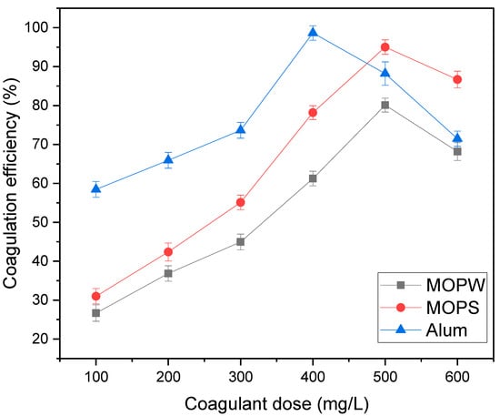 In general, inadequate doses or overdoing would result in poor coagulating performances. Therefore, it is essential to identify the optimal dose in order to reduce dosing costs and sludge formation, as well as to achieve optimal treatment efficiency. Figure 3 illustrates the effect of the coagulants’ dosages (100-600 mg/L) on the removal of MB11 using MOPW, MOPS, and alum coagulants. As demonstrated in Figure 3, there is a continuous elimination of MB11 when increasing coagulant dosages up to 400 mg/L and 500 mg/L for alum and MOPW/MOPS, with color elimination percentages of 98.65%, 80.12%, and 95.02%, respectively, these performances are relatively high compared to that of other bio-based materials for the removal of dye wastewaters (synthetic or real) (Table 2). The two biocoagulants exhibit similar color reduction patterns, as they are observed to increase and decrease constantly, indicating that both might follow adsorption and charge neutralization mechanisms to neutralize the anionic portion of the MB11 [31,32], resulting in an equivalent trend of color increase when overdosing occurs. The operating mechanism of alum may be described as follows: the introduction of this coagulant to the synthetic dye solution quickly hydrolyzes the salts, forming cationic species capable of gathering the negatively charged portion of MB11 and neutralizing it. Particle destabilization may then occur [33], entrapment is also a possible mechanism for this chemical coagulant. A clear difference in the coagulation efficiency between MOPW and MOPS is also observed through the whole pattern (Figure 3) and visually (Figure 4). This trend can be explained by the fact that water purification by MO seed coagulant is predominantly due to the activity of the seed’s protein. The latter represents around 37% of the MO seed kernel content [34]. The primary causes of flocculation are basic polypeptides with molecular weights ranging from 6000 to 16,000 Daltons. The functional groups in the MO seed proteins’ side-chain amino acids are expected to help with water clarification. Madrona et al. [35] established that these molecules found in MO do not dissolve properly in water without the addition of salt, thus, explaining the better coagulation efficiency when MOPS is used.