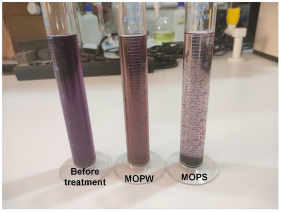 Coagulation studies were conducted using jar-test equipment in 1 L beakers (VELP Scientifica Srl, Italy). Each beaker was filled with 200 mL of MB11 solution with varying concentrations and initial pH values (adjusted with 0.5 M HCl or 0.5 M NaOH) measured by a pH meter (Mettler Toledo, Columbus, OH, USA), along with varying amounts of freshly prepared MOP extracts (MOPS or MOPW) and alum. Each parameter’s optimum value was determined using the one factor at a time (OFAT) approach. The mixture of MOPS/MOPW and alum with MB11 was agitated at 200 rpm for 3 min, followed by 30 rpm for 20 min; flocs were allowed to settle for 60 min. Afterwards, samples (20 mL) were extracted using a volumetric pipette 3 cm below the surface of the mixture and centrifuged (3000 rpm for 10 min). Using a spectrophotometer (Agilent Cary 60 UV-Vis, USA) at a wavelength corresponding to the maximum absorbance of 535 nm for MB11 dye, the final concentrations of the dye were measured. All studies were undertaken at room temperature (25 °C ± 2) and were repeated two times. The percent elimination of MB11 dye was determined using Equation (1):