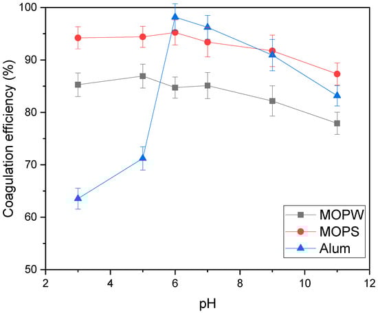 Effect of initial pH on coagulation efficiency (dose = 400 mg/L (alum), 500 mg/L (MOPW/MOPS), 1 M NaCl, 100 mg/L of MB11, 60 min of settling).