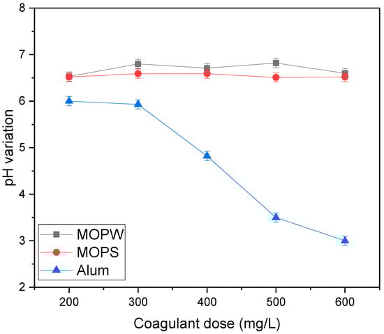 Because coagulants have their own suitable pH range that impacts the efficiency of their activities, it is a crucial parameter to consider. The pH range of 3 to 11 was selected for this investigation. As depicted in Figure 5, pH has little influence on the dye removal effectiveness of MOPW and MOPS, whereas a clear fluctuation is observed concerning the alum pattern. MB11 removal reduces with increasing pH, from 98.18%, 95.24%, and 85.12% at pH 6.5 to 89.18%, 87.32%, and 77.92% at pH 11 for alum, MOPS, and MOPW, respectively. Optimal performances of all coagulants were shown to occur at around pH 6.5. As mentioned in the previous section, MO is rich in protein content; these proteins have an isoelectric point in the range of pH 6.5–7.5 [36]. Consequently, this protein is cationic at pH < 6.5-7.5, which enables MOPS and MOPW to efficiently remove the anionic dye (MB11) across a broad pH range (from 3 to 6.5). This offers a significant advantage over alum as well as other natural coagulants, which are typically effective only within a limited pH range (Table 2). According to Tiaiba et al. [37], the dominant aluminum species at this pH range is Al3+. The interaction between the cationic charges of Al3+ and the anionic charges of MB11 promotes a better coagulation efficiency; this is likely to explain the favorable coagulation efficiency occurring at this pH range. An investigation on the pH solutions’ variation was also conducted for the three coagulants since the requirement for drinking water is between 6.0 and 8.5. The results are presented in Figure 6. As can be observed, no influence on the pH was recorded when MOPS and MOPW are applied to the synthetic dye solutions; this is likely owing to the fact that MOPS and MOPW do not hydrolyze efficiently in water due to their polymeric nature. Concerning alum, on the other hand, the final pH values are below the acceptable limit of drinking water, drastically decreasing with the increase of alum dosage (from 6.5 to 3.5 when the dosage increases from 200 to 600 mg/L). This may be the result of alum consuming water alkalinity during the hydrolysis; indeed, when alum is introduced to water, it first generates Al3+ and SO42-, after which the Al3+ reacts with the OH in the water to form Al(OH)3. As a consequence, consuming hydroxyl ions reduces the alkalinity and ultimately pH of the synthetic effluent. According to our findings, appropriate pH of wastewater discharge may be reached without the need for neutralization, representing a strong advantage to the use of MO as a replacement of chemical coagulants.