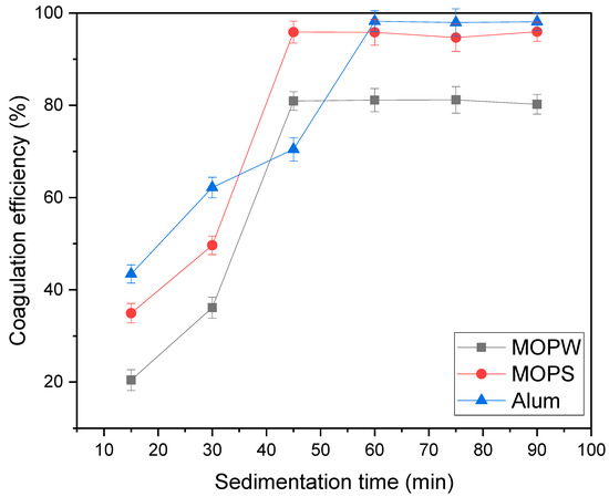 Effect of sedimentation time on coagulation efficiency (%) (pH = 6.5, dose = 400 mg/L (alum), 500 mg/L (MOPW/MOPS), 100 mg/L of MB11, 1 M NaCl).