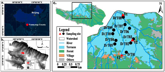 (a) Location of the Quanfuzhuang River Basin (QBS), (b) topography of the Yuanyang County, and (c) landscape pattern of the Quanfuzhuang River Basin (QBS). The black solid circles in (c) indicate the sampling site of terrace water and groundwater (T01–T10 and D01–D10, respectively); the red solid triangles in (c) indicate the sampling site of precipitation (Y1–Y3); and the weather station is located at Y3.