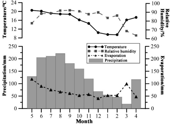 Precipitation in the study area is adequate, with substantial differences in the dry and wet seasons. The meteorological data gathered from the observation stations from May 2015 to April 2016 (Figure 2) showed that the annual precipitation in the study area was 1532.19 mm. Approximately 72% of the total precipitation (1107.26 mm) occurred in the wet season, while the remaining 28% (424.93 mm) occurred during the dry season. The average monthly precipitation was 184.54 mm. The precipitation provided a sufficient and stable supply of water for rice cultivation in the terrace areas. Like precipitation variation, the study area was warmer and wetter in the wet season (temperature of 18.92 °C, relative humidity of 88.32%) than the dry season (temperature of 12.89 °C, relative humidity of 79.96%).