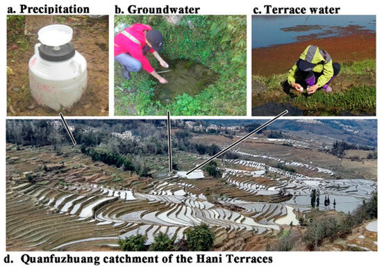 Sampling sites were set along different elevation gradients in the Quanfuzhuang catchment of the Hani Terraces. The elevation ranged from 1500 m to 1800 m, and the elevation difference was 300 m (Figure 1). Samples were collected from May 2015 to April 2016, once a month at all sampling sites, lasting for a year. Ten groundwater sampling sites, ten terrace water sampling sites, and three precipitation sampling sites were established, allowing us to obtain a total of 120 groundwater samples, 120 terrace water samples, and 36 precipitation samples. As shown in Figure 3, all the precipitation samples were collected from 3 reformed rain gauges (Figure 3a), all the groundwater samples were spring water with a slow flow rate (0~0.2 m/s) (Figure 3b), and all the terrace water samples were collected from the rice terrace (Figure 3c).