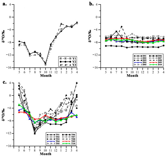 In this study, the isotopic compositions in precipitating and terrace water were calculated using the measured isotopes in precipitation corrected by local evaporation line (LEL), and the calculation for precipitating and terrace water were processed using the Hydrocalculator software [42] (Ver. 1.03, available at http://hydrocalculator.gskrzypek.com (accessed on 5 January 2021)).