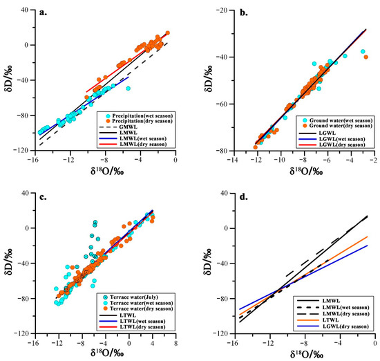 (a) Global Meteoric Water Line (GMWL) and Local Meteoric Water Line (LMWL) for the study area based on the data of individual sampling events from May 2015 to April 2016. (b) Local Ground Water Line (LGWL) for the study area based on the data of individual sampling events from May 2015 to April 2016. (c) Local Terrace Water Line (LTWL) for the study area based on the data of individual sampling events from May 2015 to April 2016. (d) The relationships between the δD-δ18O relationships in precipitation, ground water, and terrace water.