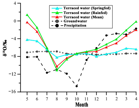 In terms of spatial variability, no significant altitude effect was observed in the δ18O values of the terrace water, except for the samples collected in October and November. Furthermore, based on the magnitude of fluctuations observed in the stable isotope values of the collected samples, terrace water was classified into two types: stable terrace water (coloured sample sites) and fluctuating terrace water (black sample sites). The stable terrace water showed no significant fluctuations in the δ18O values throughout the year, similar to the pattern observed in the case of groundwater, while the oxygen stable isotope ratios of the fluctuating terrace water displayed a ‘U-shaped’ variation pattern, showing depletion from May to August, stability from September to December, and enrichment from January to April.