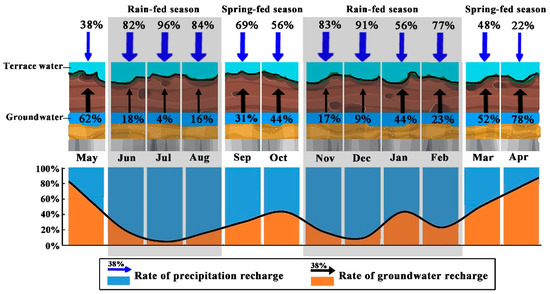 In terms of temporal characteristics (Figure 7), the recharge to the terrace water can be divided into two different recharge periods according to the aforementioned average annual recharge ratios of precipitation (66.83%) and groundwater (33.17%): the rain-fed season (average annual recharge ratio of precipitation > 66.83%) and the spring-fed season (average annual recharge ratio of groundwater > 33.17%). The two types alternated within a year, following seasonal changes. The first rain-fed season was from June to August 2015, during which the high rainfall in the terrace areas increased the proportion of precipitation recharge to 87.33%. The first spring-fed season was from September to October 2015. When the precipitation peaked in August, the groundwater recharge from the precipitation also reached saturation. The groundwater began to flow outwards to recharge the terraces, with the ratio of groundwater recharge increasing to 37.50%. The second rain-fed season was from November 2015 to February 2016, during which the groundwater discharge decreased, and the recharge ratio of precipitation increased to 76.75%. The second spring-fed season was from March to May 2016. As the amount of precipitation decreased to its lowest value, the terraces were recharged by the groundwater, which had been replenished in the second rain-fed season (64%). In particular, terrace water recharge in May was consistent with the dry season because the alternating rain-fed and spring-fed cycle occurred approximately 1–2 months later than the dry and wet season cycles. This delay was calculated according to the time required for recharging the terrace water.