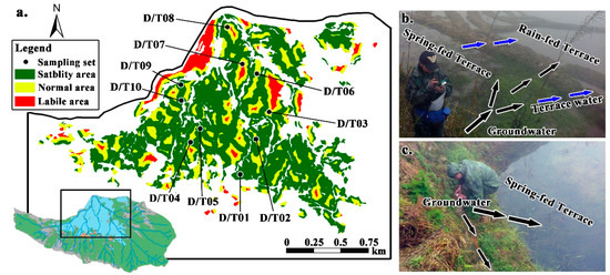 (a) Map showing the location of terrace water sampling sites at the water stability zoning (data on water stability zoning were taken from Wang [47]). (b) Indirect recharge of groundwater to rain-fed terraces, (c) direct recharge of groundwater to rain-fed terraces.