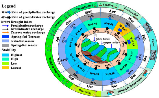The temporally alternating recharge periods of spring-fed and rain-fed seasons and the spatially interwoven distribution of rain-fed and spring-fed types were the key mechanisms to maintain stable water sources in the Hani terraces. In this context, the recharge from groundwater and agricultural interventions on a spatial scale regulated the system to some extent, replenishing the terraces during the two dry months.
