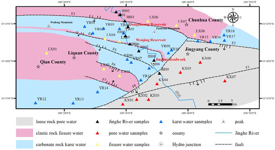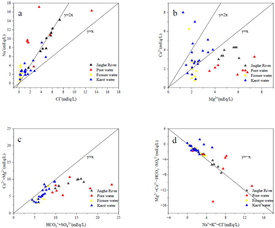 - There are many hydrogeochemical types of water bodies in the study area. Jinghe River and some pore water are mainly subjected to evaporation-concentration. Fissure water and karst water are mainly subjected to rock-weathering. The main source of Ca2+ and Mg2+ in karst water and fissure water should be the weathering dissolution of carbonate minerals. The main reason for the unstable distribution of cations is that the water body in the study area has undergone different degrees of cation exchange.