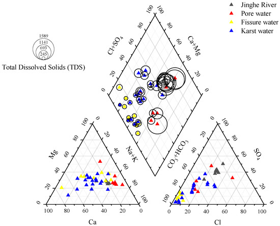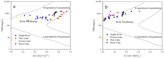 - In general, Jinghe River and pore water are weakly alkaline, with high TDS value (brackish water). Na+ and K+ are the main cations in Jinghe River, while Cl− and SO42− are the main anions. HCO3− and SO42− are the main anions of pore water, fissure water and karst water, and the content of cations is different, indicating that the formation mechanism of the hydrochemistry is complex.