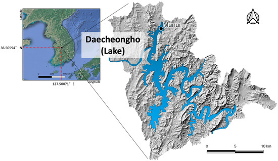 Daecheong Lake is an artificial lake that is elongated along the north–south axis. It has a watershed area of 4184 km2, lake area of 72.8 km2, and lake volume of 1.5 billion m3. The study area was set up in Munui (latitude: 36.505945°; longitude: 127.500714°; average water depth: 17.4 ± 2.2 m; inter-annual variability in water depth: 11.3–22.1 m), which is located in an inlet area that is representative of the watershed environment and water quality in Daecheong Lake. The water quality and plankton community were surveyed twice per month (at the beginning of the month and after a fortnight) from March 2017 to November 2019, excluding the winter months (Figure 1).