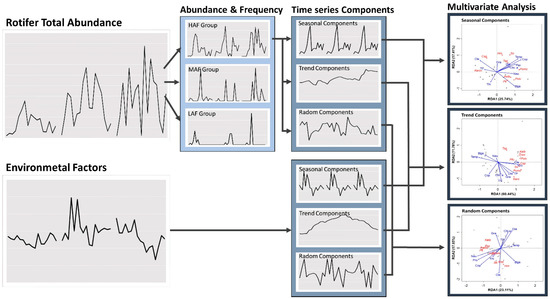 To evaluate the abundance patterns of rotifer species depending on changes in environmental factors, we performed redundancy analysis (RDA) for each of the aforementioned decomposed components using the “vegan” package in R. RDA, rather than canonical correlation analysis (CCA), was judged to be an appropriate method for data analysis based on the results of detrended correspondence analysis (DCA) using rotifer abundance and environmental factor data (gradient length < 4.0) [52,53]. All decomposed components of the three rotifer groups’ abundance (HAF, MAF, and LAF group) and environmental factors were analyzed. The decomposed components of each rotifer group were set as response variables for their respective analysis, and those of environmental factors were set as explanatory variables (Figure 2).