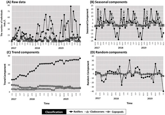Inter-annual changes (2017–2019) in the number of zooplankton individuals by taxon (A) and patterns of change in the seasonal (B), trend (C), and random (D) components derived from the time series of rotifers, cladocerans, and copepods in Daecheong Lake.