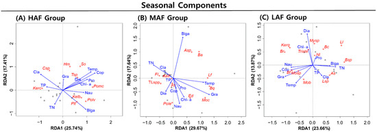 When the seasonal component was used for RDA, the first and second RDA axes explained the relationships between rotifer occurrence patterns and environmental factors to a greater extent than the RDA axes obtained using undecomposed population data. Each group of the rotifers was found to interact differently with environmental factors. In the HAF group, the two RDA axes explained 43.15% of the variance, and all rotifer species were significantly correlated on both axes (RDA species score > 0.5; Figure 6A). Moreover, rotifer species in the HAF group showed positive correlations with copepod abundance and water temperature. In the MAF group, the two RDA axes explained 47.31% of the variance. Rotifers in this group showed correlations with green algae, water temperature, nauplius abundance, and blue-green algae (in decreasing order; Figure 6B). In the LAF group, the two RDA axes explained 37.53% of the variance, and the explanatory power was lower than those in HAF and MAF (Figure 6C). Rotifer species in the LAF group were positively correlated with green algae, copepod abundance, water temperature, TN, nauplius abundance, diatoms, and Chl-a (in decreasing order). Overall, the analysis of seasonal components revealed that water temperature was significantly correlated with rotifers in all groups.