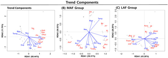 Redundancy analysis of the trend components (derived from the time series of the abundance estimates of three rotifer groups) and environmental factors. (A) High abundance and frequency rotifers group, (B) Middle abundance and frequency rotifers group, (C) Low abundance and frequency rotifers group.