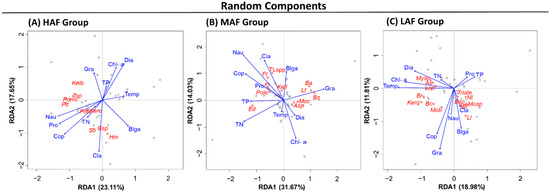 Redundancy analysis of the random component (derived from the time series of the abundance estimates of three rotifer groups) and environmental factors. (A) High abundance and frequency rotifers group, (B) Middle abundance and frequency rotifers group, (C) Low abundance and frequency rotifers group.