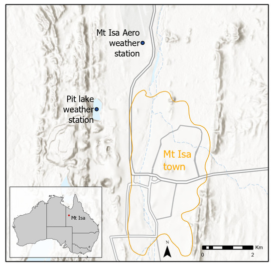 The case study mine pit lake is approximately 1.3 km west of the town of Mount Isa, Queensland, Australia (Figure 1), with the lake bed at approximately 300 m above mean sea level. The climate is classed under the Köppen–Geiger system as semi-arid hot. A long-term weather station exists at Mt Isa airport, approximately 3 km north-east of the pit lake. At this station the mean annual rainfall between 1966 and 2019 was 460 mm, with a maximum of 1092 mm and minimum of 93 mm. Approximately 77% of the total annual rainfall in that period occurred in the four-month wet season, December to March. The average number of wet days (any trace of rain at the weather station rain gauge) ranges from 0.9 in August to 10 in January, averaging 51 per year. The average annual pan evaporation measured at the weather station between 1975 and 2020 was 3061 mm/year with daily evaporation ranging between 5.5 and 11.0 mm/day, with highest evaporation occurring during the wet season. The mine pit is approximately 850 m long and 360 m wide and its base is 50 m below ground level giving an approximate storage capacity of 7 GL. From the crest of the pit to the water level during the evaporation measurement period is 30 m.