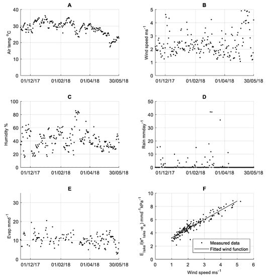 Data measured at the pit lake floating weather station: (A) average daily temperature; (B) wind speed; (C) relative humidity; (D) rainfall; (E) evaporation; (F) Elake/(e*lake-ea) against wind speed.