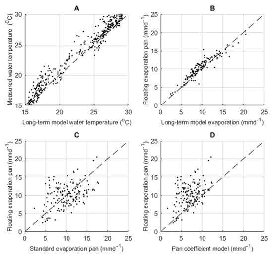 Scatter plots of: (A) surface water temperature modelled using the equilibrium model vs. measured surface water temperature; (B) evaporation using the long-term model vs. evaporation measured using the floating evaporation pan; (C) evaporation measured at the Mount Isa weather station vs. evaporation measured using the floating evaporation pan; (D) applying a pan coefficient of 0.7 to evaporation measured at the Mount Isa weather station vs. evaporation measured using the floating evaporation pan.