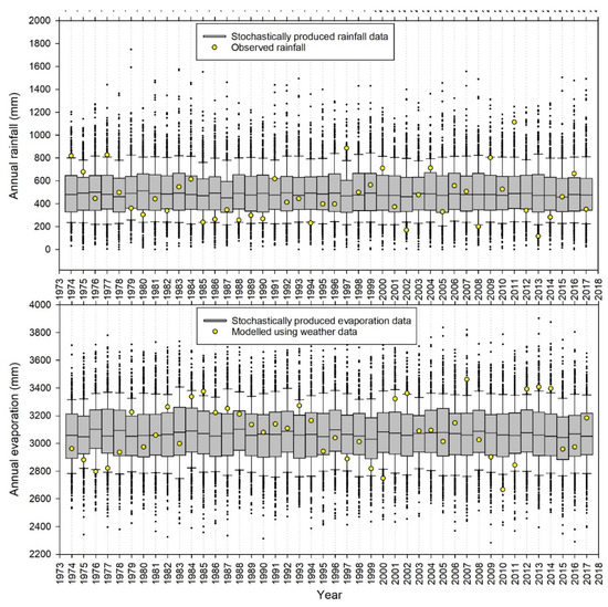 Comparison of reconstructed evaporation and measured rainfall with results of annual stochastic simulations The box plots show 10th, 25th, 50th, 75th and 90th percentiles of model realisations with outliers shown as dots.