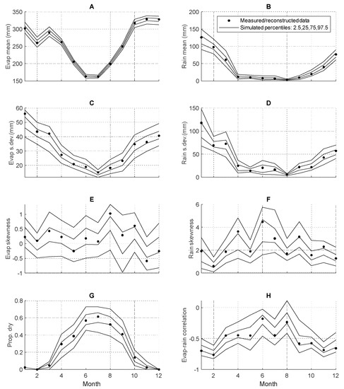 Comparison of reconstructed evaporation and measured rainfall statistics with results of monthly stochastic simulations (Month 1 = January): (A) evaporation mean; (B) rainfall mean; (C) evaporation standard deviation; (D) rainfall standard deviation; (E) evaporation skewness coefficient; (F) rainfall skewness coefficient; (G) proportion of months that are dry; (H) evaporation–rainfall correlation coefficient.