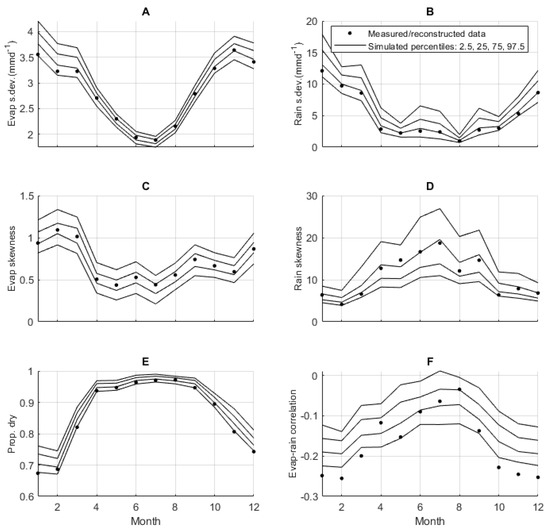 Comparison of reconstructed evaporation and measured rainfall statistics with results of daily stochastic simulations for each month (Month 1 = January): (A) evaporation standard deviation; (B) rainfall standard deviation; (C) evaporation skewness coefficient; (D) rainfall skewness coefficient; (E) proportion of days that are dry; (F) evaporation–rainfall correlation coefficient. Plots of mean values not shown because they are identical to those in Figure 5.