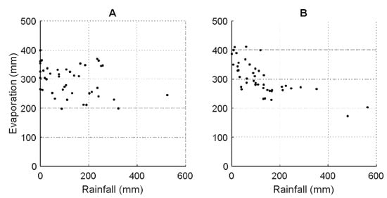 Relationship between evaporation and rainfall: (A) a representative sample realisation from the daily stochastic model (correlation coefficient = −0.31); (B) reconstructed evaporation and measured rainfall data (correlation coefficient = −0.70).