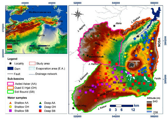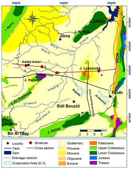 The study area, situated between longitudes 9°10′00″ E to 9°45′00″ E and latitudes 34°55′00″ N to 35°20′00″ N, constitutes the Sidi Bouzid North basin located in central Tunisia. It covers an area of approximately 1508 Km2 (Figure 1) and extends from Jebel Rakhmet, Jebel Hamra, and Jebel Mghila in the West to the North-South axis (NOSA) in the East, and from the Zawiya-Roua chain in the North to Jebel Kebar in the South. To the Southwest, it is limited by the Jebel Al Hfay. The study area is made of three sub-basins: (i) the Southern part: Sidi Bouzid, (ii) the Western part: Awled Asker, and (iii) the Eastern part: Oued El Hjal. The overall elevation of the area ranges between 238 m and 640 m above sea level (a.s.l.). This area belongs to a semi-arid Mediterranean climate with a mean annual precipitation of 223 mm and an average yearly temperature of 19 °C [34]. The average annual evapotranspiration is 180 mm.