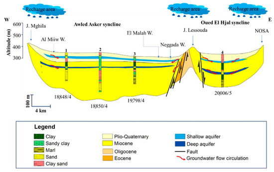 The conceptual model of the Sidi Bouzid basin has been schematized and presented in Figure 3. The Sidi Bouzid basin is a detrital Mio-Plio-Quaternary complex hosting two aquifers. The borehole cross-section represents the superposition of three layers. The first layer, widely distributed throughout the study area, constitutes the shallow reservoir (with an average thickness of 40 m) made of sand with gravel and clayey intercalations. The second layer is an impermeable and sometimes semi-permeable aquitard with an average thickness of 45 m, while the third layer is the deeper aquifer with an average thickness of 25 m. Groundwater is recharged through atmospheric precipitation, supplemented by lateral runoff and irrigation return flow. Groundwater discharge occurs by lateral outflow, evapotranspiration, evaporation areas, and artificial extraction (for domestic and agricultural use). The groundwater flows from the mountainous boundary area to the northeast of the study area. Finally, it discharges to the evaporation area (Negada and Al Akarich) and El Hjal Wadi, for both aquifers shallow and deep [38]. Lastly, the communication between the aquifers is only downstream of the basin. The hydrodynamics of the water are influenced by the aquifer geometry and the tectonic structures. The groundwater flow converges from Miocene outcrops in two directions: (i) the main direction is from West to East, while (ii) the secondary flow is from NW to SE. The groundwater overexploitation is intense in the central and downstream parts, and it has experienced a constant increase during the last years [36].