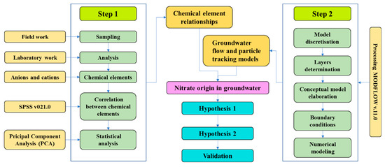 In this study, a two-step approach was employed: (i) the first step aimed at identifying the relationship between NO3− and other chemical elements in groundwater, and (ii) the second step aimed at identifying the different NO3− origins developing a numerical model to simulate the groundwater flow and particle circulation (Figure 4). This approach was used to test two hypotheses to explain NO3− accumulation in groundwater. The first hypothesis describes a “top-down” mechanism where NO3− is thought to be of anthropogenic origin and infiltrated from the surface through stratified layers of sand and sandstone. In this hypothesis, the particles (nitrates in our case) reach the groundwater and migrate inside it according to the existing flow in a transient state. It is determined by the circulation time of the particles from surface to groundwater. The second hypothesis is a “bottom-up-laterally” mechanism where NO3− is deposited onto a stable soil surface through aerosol deposition and has concentrated in the subsoil over time. In this hypothesis, it is considered that the nitrates are of natural origin (linked to sedimentation) and are found in the subsurface. This mechanism has been used to explain NO3− reservoirs found in arid and semi-arid areas [39].