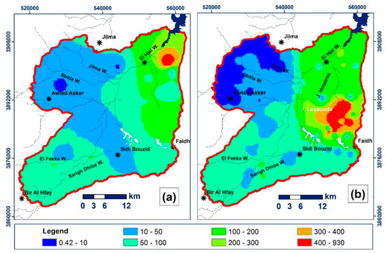 Figure 5, generated using distribution of NO3− concentrations in groundwater through Kriging interpolation technique, shows that the lowest NO3− concentrations are in the western area of the Sidi Bouzid North basin and in the Awled Asker sub-basin. While towards the East of the study area, NO3− concentrations become very high, often exceeding 300 mg/L in both the shallow (Figure 6a) and deep (Figure 6b) aquifers. In the south, NO3− concentrations vary from 30 mg/L to 120 mg/L. The highest levels of NO3− are around 930 mg/L and are recorded in the Oued El Hjal sub-basin. This differentiation of spatial concentration distributions of nitrate is due to the hydrodynamic functioning of the aquifer system which is also influenced by lithostratigraphic variations.