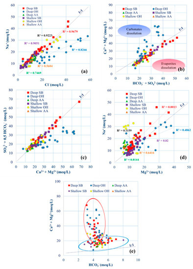 To better discriminate all the cation exchange phenomena within the aquifers system, a plot of Na+ vs. Mg2+ is shown (Figure 6d). Cation exchange takes place with the colloids of organic matter and rich clay minerals present in the aquifer matrix, which release Na+ and adsorb Ca2+ and Mg2+, leading to an increase in Na+ concentrations in groundwater. Here, all samples show a slight abundance of Na+ with respect to Mg2+, except for the samples from the deep aquifers of Oued El Hjal, in which excess of Mg2+ is released in groundwater via dedolomitization which triggers Na+ adsorption. Finally, Figure 6e shows that the sum of Ca2+ and Mg2+ correlates very poorly with HCO3−, excluding simple dolomite dissolution mechanism as the main driver of the observed patterns.