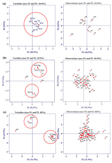 Projection of observations and variables into the factorial plane (F1 × F2): (a) sub-basin of Awled Asker (13 samples), (b) sub-basin of Oued El Hjal (36 samples), and (c) sub-basin of Sidi Bouzid (57 samples).