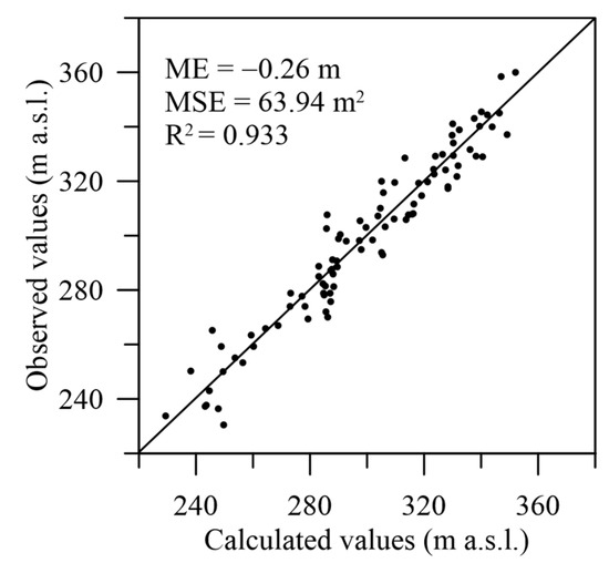 The model calibration was carried out by automatically tuning the K values and other parameters like maximum evapotranspiration rate, recharge rate, and drain conductance, reported in Table 2 with their composite sensitivities. The comparison between observed and simulated head for both the shallow and the deep aquifers is shown in Figure 9. The points are scattered along the 1:1 line, with no apparent pattern. However, there is a slight underestimation in the calculated heads as suggested by the mean error (ME) that denotes approximately −0.26 m of error, which is acceptable compared to the whole piezometric range simulated here (more than 150 m) with the R2 being higher than 0.9 (Figure 9). The relatively large MSE of calculated heads could have been due to local variability of hydraulic conductivity here not considered to maintain the simplicity of the model as much as possible.