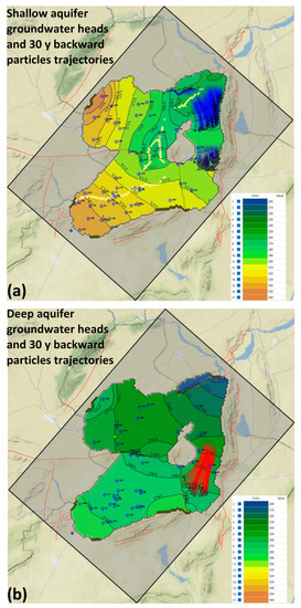 Contours of the calculated groundwater heads for the shallow (a) and deep aquifers (b). The backward particle trajectories from the zones with high NO3− concentration for the period 1990–2020, in blue for the shallow aquifer and red for the deep aquifer; black points delineate the NO3− source zones in 1990.