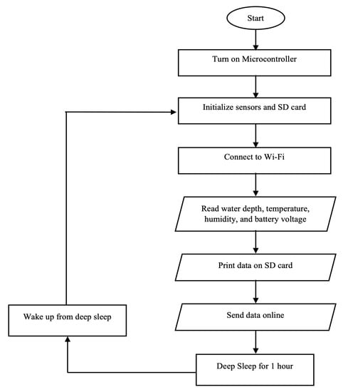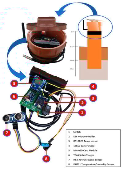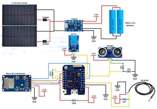 The sensor unit was enclosed in a 4″-diameter PVC cap that was mounted on top of a 4″-diameter AWD pipe. The low-cost sensor is composed mainly of four sensor modules: HC-SR04 ultrasonic distance sensor, DS18B20 waterproof temperature sensor, DHT11 temperature/humidity sensor, and the microSD card adapter module. Data from the sensor modules are integrated by the ESP8266 microcontroller which sends data to the online database through Wi-Fi. The sensor unit was also equipped with two Li ion batteries, a solar charger, and two mini solar panels. Figure 1 shows the connection of the sensor circuitry.