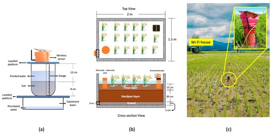 The actual field deployment was performed in one of the paddy fields in a rice production area located in Brgy. San Roque, Victoria, Laguna, Philippines, situated 700 m from Laguna Lake. The area is characterized by predominantly clayey soils, and has an intensive production of rice that is regularly cultivated during the wet and dry cropping seasons. The rice field is irrigated using a shallow tube well (STW). The application of AWD is more compelling in this system as the farmers can greatly reduce fuel costs in STW pumping through less frequent irrigation during the dry cropping season. The field setup was composed of a 14 × 44 m2 basin plot. Five AWD pipes equipped with low-cost sensors were evenly spaced along the plot’s middle horizontal transect in line with the irrigation inlet. The manually observed pipe was installed in a highly accessible location within the plot, about a meter away from the bund to avoid measurement bias. A rain gauge was also installed in the field to monitor water inputs in the basin aside from irrigation water. The sensors were set to read water level data for every hour using Wi-Fi, while manual observations were made twice a day, i.e., at 8:00 am and 2:00 pm. A Wi-Fi modem and a 5 km-range Wi-Fi extender powered up by batteries were installed in the pump house located 30 m away from the plot. The sensor deployment was continuous within two weeks, except during the three consecutive days of a storm that transpired within the experimental period. Figure 6c shows a photo of the sensor testing done under actual field conditions.