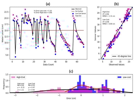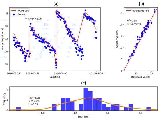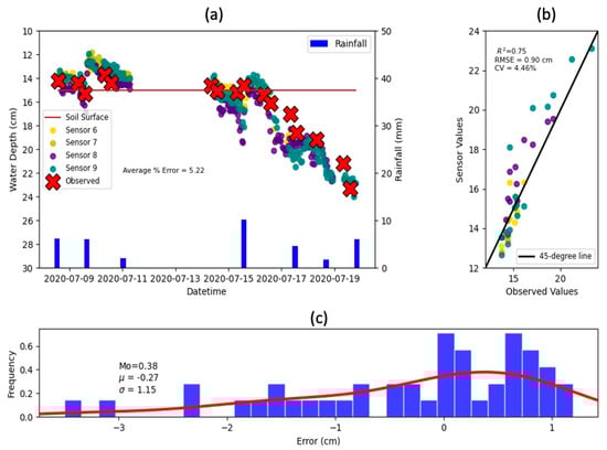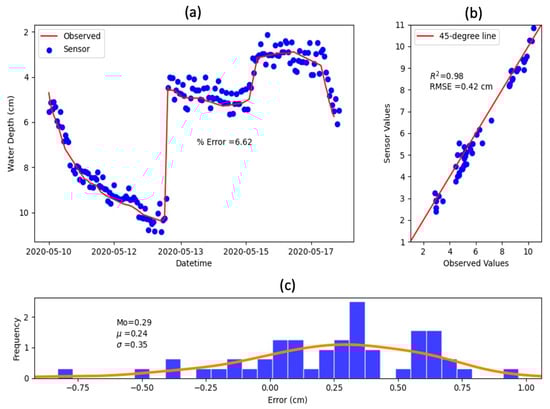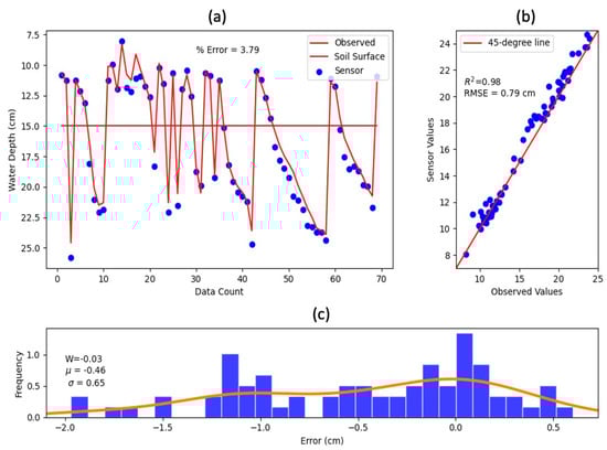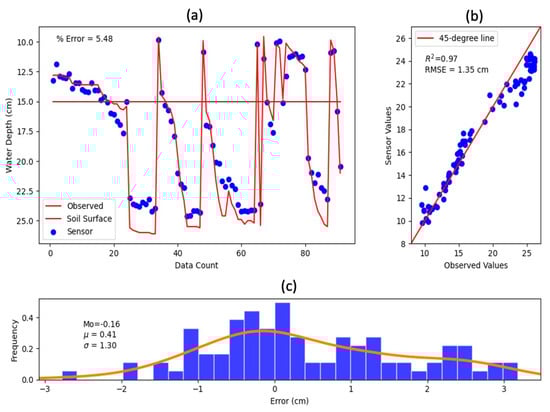 Performance of the low-cost sensors in actual paddy field conditions showing (a) observed and sensors’ field water level measurements, (b) comparison of observed and sensors’ values, and (c) error (observed-sensor) distribution with Gaussian KDF fit.