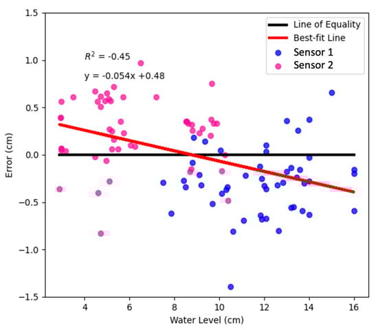 To further investigate the relationship of the errors with respect to water level depths, a simple linear regression was made (Figure 9). The R2 = −0.45 suggests that there exists a negative relationship between sensor accuracy and water level depths, albeit being moderate. But this moderate correlation influenced sensor readings in the millimeter range of accuracy. One investigator claimed these instabilities to be due to the lack of monotonicity, an occurrence of miscommunication between the components of the internal circuitry when reading peak signals []. Shorter ranges are more prone to these instabilities since the sensor processor tends to miss out faint peak signals from the comparator, resulting in longer duration before the echo pin signal goes low. This anomaly consequently results in longer travel time of sound, which further results to overestimation of measurements. However, the range of critical values was never established in the investigation. Having sufficient time for the sound waves to travel between the sensor and the target surface is highly advised in minimizing the occurrence of this anomaly. In this study, most of the overestimates were observed in ranges above 9 cm, while underestimates mostly occurred in even shorter ranges (less than 9 cm). Nevertheless, the sensor performance still remains to be acceptable from the economic viewpoint. The performance values of the low-cost sensor are also comparable to the water level sensor developed by Xiao et al. [] and IRRI and PhilRice [], which they claimed to be also suitable in paddy field conditions.