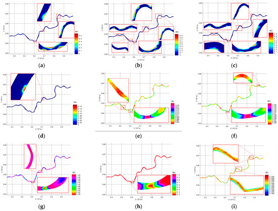 Figure 4a–d show that the HSI values of shallow water areas adjacent to the banks and bends of the river were greater than 0.5. These sections of the river meet the requirements of Parabramis pekinensis for flow velocity and depth during the spawning period. Therefore, they were suitable spawning sites for the fish. Considering that spawning grounds require high water depths and flow velocities, there were few appropriate waters for Parabramis pekinensis in the study area. When the flow rate increased from 100 to 500 m3/s, the spawning region increased in size, the number of spawning places increased, and the maximum HSI value increased from 0.6 to 0.9. When the flow rate was increased by 3000 m3/s, the highest HSI value was only 0.16, indicating that the study area was unsuitable for Parabramis pekinensis spawning at this flow rate and that increasing the flow rate was ineffective. There was no reason to further increase the flow rate.