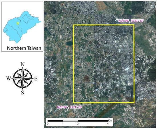 The study area was the Dongmen drainage in northern Taiwan, with an area of approximately 22.22 km2, as illustrated in Figure 1. The drainage was designed under the assumption of a 10-year flood recurrence interval. No bank revetment is present in some river sections, and box culverts are insufficient in the area prone to flooding. Blocking weirs have been erected in some river sections, which has raised the water level and affected upstream drainage. All these factors contribute to flooding in the Dongmen drainage.