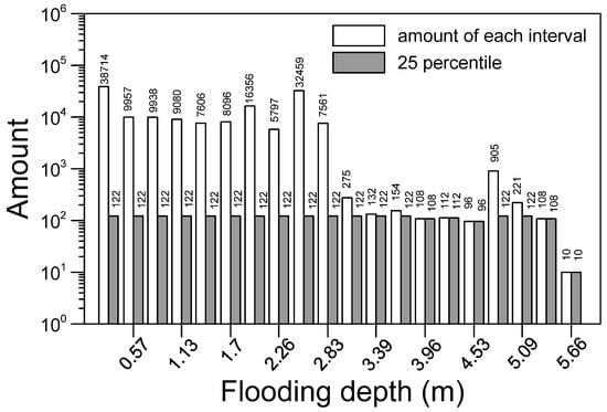 Original amount of data in various flooding depth ranges and the amount of 25th percentile data.