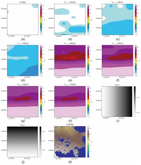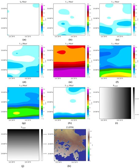 Schematic of the data combination, with data being 8-h accumulated rainfall, X and Y meshes, and a digital terrain model. (a) the most recent hour rainfall; (b) the most recent 2 h of accumulated rainfall; (c) the most recent 3 h of accumulated rainfall; (d) the most recent 4 h of accumulated rainfall; (e) the most recent 6 of accumulated rainfall; (f) the most recent 8 h of accumulated rainfall; (g) the most recent 10 h of accumulated rainfall; (h) the most recent 12 h of accumulated rainfall; (i) the longitude mesh; (j) the latitude mesh; (k) elevation information.