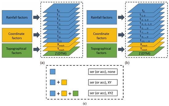 Combination classification of: (a) rainfall data in different time series (ser), coordinates (XY), and elevation (Z); and (b) cumulative rainfall data in different periods (acc), coordinates (XY), and elevation (Z). (c) Combination of different physical factors.
