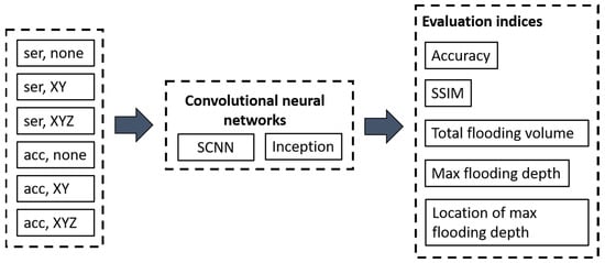 The rest of the paper is structured as follows: Section 2 provides a brief description of the data used in this study and how the data were selected. In Section 3, the CNN architectures used in this study are introduced, as well as the method used to compare the output results of the two architectures, including the total flooding volume comparison, and the method used to compare the difference between two images. Section 4 provides a discussion of the convergence of the two CNN architectures when various combinations of rainfall data types and grids (excluding XYZ coordinates, including XY coordinates, and including terrain elevation) were used. The convergence of the training process indirectly reflected the success or failure of the established model. In Section 5, the predictions made by the model were compared with the results of the physical model, including comparisons of the total flooding volume, similarity, and location of the maximum flooding depth. A complete rainfall event scenario was selected to illustrate how flooding would vary in a single location with time, and under the two-dimensional method applied.