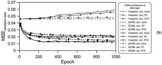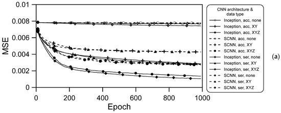 In this study, using the method described in Section 2.4, 1447 sets of rainfall data were extracted from abundant rainfall and flooding data, combining spatial XY and XYZ data, and were input to two CNN architectures (12 models) for training. A random 10% of the datasets was selected for validation. We thus employed 1302 datasets for training and 145 for validation during the training process. This section discusses the convergence of different data combinations under different CNN architectures.