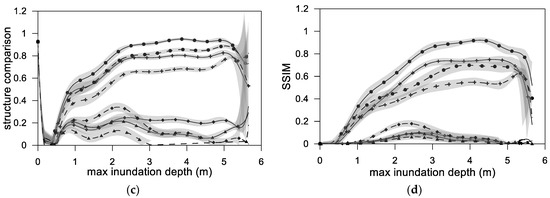 Structural similarity index (SSIM) similarity in the flood results produced by various models to the corresponding actual data: (a) luminance comparison, (b) contrast comparison, (c) structure comparison, and (d) SSIM comparison.
